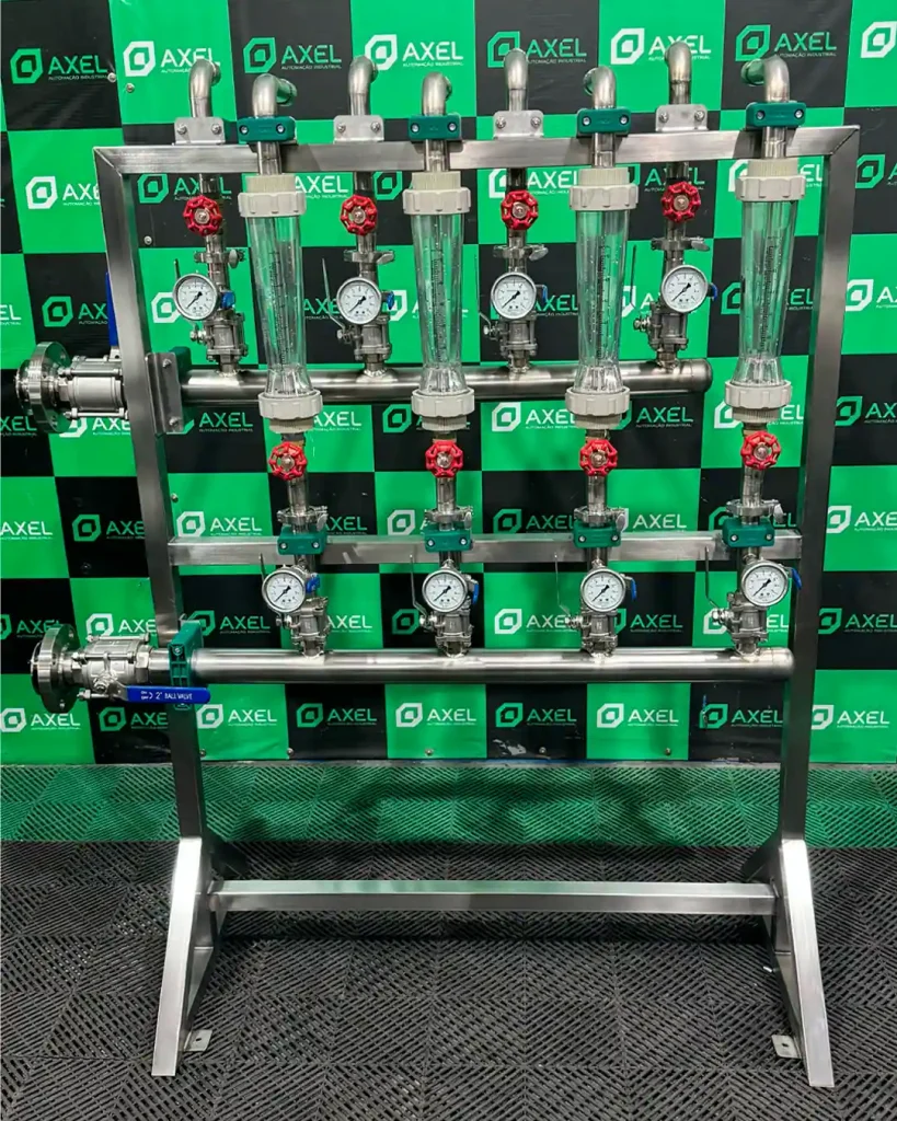 distribuição e controle de dosagem de água. Fabricado em aço inox 304, ele conta com linhas individualizadas, medidores de vazão e pressão, além de conexões roscáveis ou flangeadas, tudo projetado para oferecer resistência e precisão no controle.